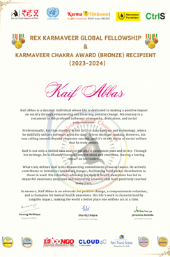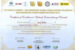 Kaif Abbas was awarded The Campus Connect – Rex Karmaveer Global Young Leaders Fellowship and the Karmaveer Chakra Awards in 2019. These prestigious accolades are granted to young visionaries from colleges worldwide who have demonstrated their potential to drive societal transformation. The award ceremony, held at the illustrious Dongra Hall, IIT-Delhi, saw Kaif receiving the TCC-GYLF Certificate of Excellence and the Karmaveer Chakra Blue Medal. This honor marks the beginning of a lifetime fellowship, celebrating Kaif as a #ChampionOfChange, committed to pioneering ideas that challenge the status quo and inspire a growth mindset.